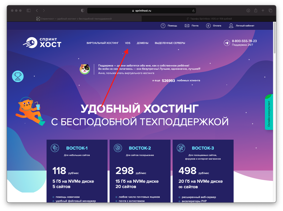 Откроется сайт Спринт Хост. В главном меню выбираем VDS