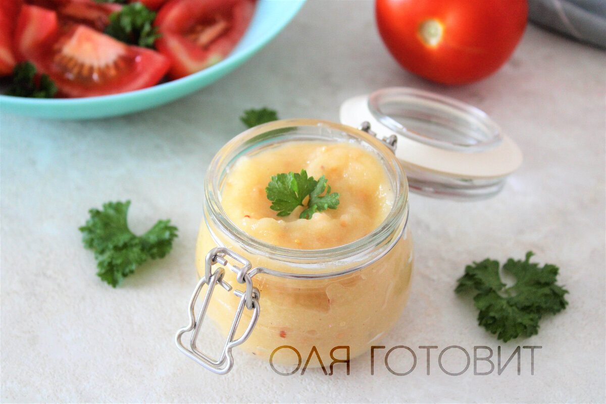 Далее при постоянном помешивании венчиком добавляем в яблочную массу оливковое масло тонкой струйкой. Добиваемся той густоты, которая нас устраивает.