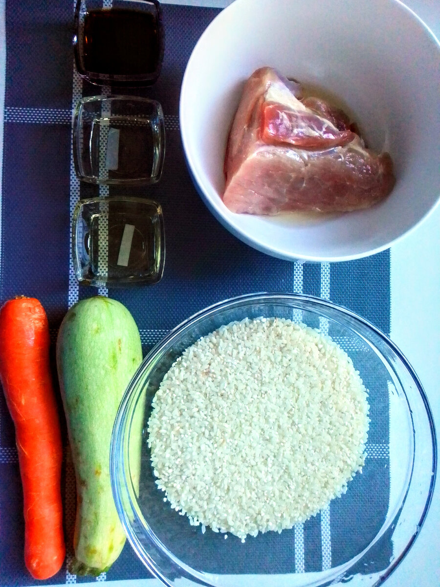 Ингредиенты: - Свинина 400г - Морковь 1 шт - Кабачок 1 шт - Рис круглый 400г - Чеснок 2 зубчика - Соевый соус 70-100мл - Кунжутное масло 70-100мл - Соль (по вкусу) - Перец красный щепотка - Кунжутные семечки 10г - Мед жидкий 1 ч.л. 1) Свинину нарезаем на небольшие кусочки, добавляем кунжутное масло 3 ст.л., 4 ст.л. соевого соуса, 1 ч.л. мёда или сахара, чеснок измельчённый и посыпаем кунжутным семечками. Оставляем мариноваться на час. Потом обжариваем ее на среднем огне минут 10-15 и убираем в сторону. 2) Рис промываем и замачиваем на пол часа. Далее варим, позже даём постоять минут 10 и добавляем масло кунжутное 3 ст.л. и 5 ст.л. соевого соуса. 3) У кабачка срезаем кожуру и режим ее тонкими полосками. Морковь тоже нарезаем на тонкие полоски. Обжариваем на сковороде минуты 3 ( пока не станут чуть помягче) и откладываем в сторону. 4) Складываем свинину, рис и овощи вместе. Можно завернуть в лист салата по желанию. Приятного аппетита