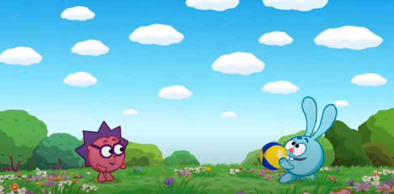 Утро. Двор Ёжика. Крош и Ёжик играют в мяч и веселятся.