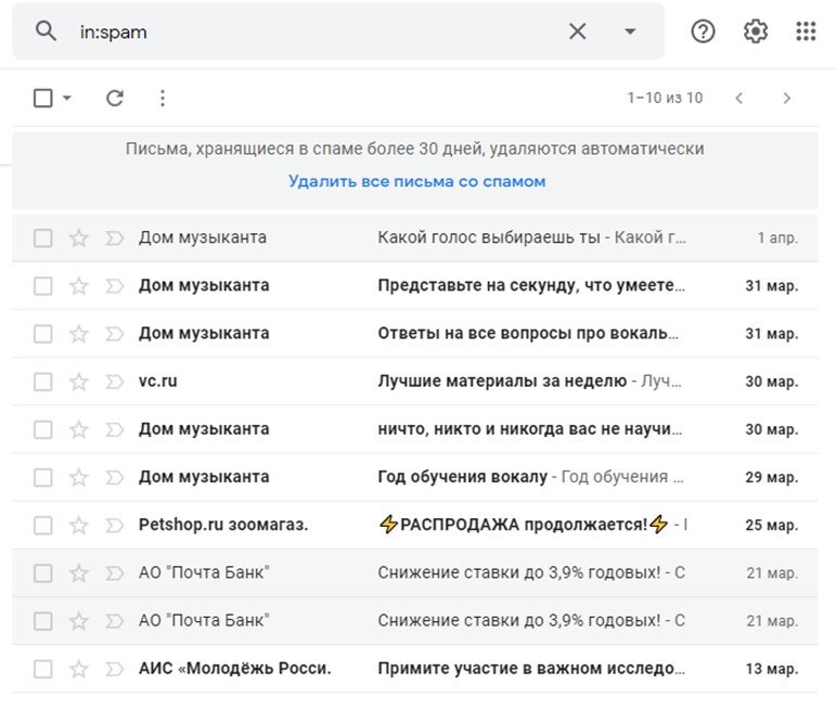 Пример: папка спама в Gmail. Владелец ящика подписан на все рассылки, кроме «Почта Банка». Отправителю писем из «Дом музыканта» стоит задуматься, не улетают ли его рассылки в спам.