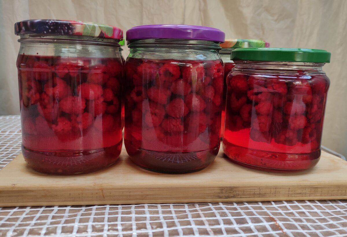 Затем ягоду надо разложить по банкам, заполнив их не менее чем на ¾. Можно добавить немного других ягод (клубника, смородина). Теперь мы знаем, сколько нужно сиропа. По объему его надо 50% от объема всех банок. Соотношение сахара и воды 1:3. Например, если у нас получилось 6 банок по 0,5 литра, т.е. их объем 3 литра, то воды надо 1,5 литра, а сахара 500 граммов.