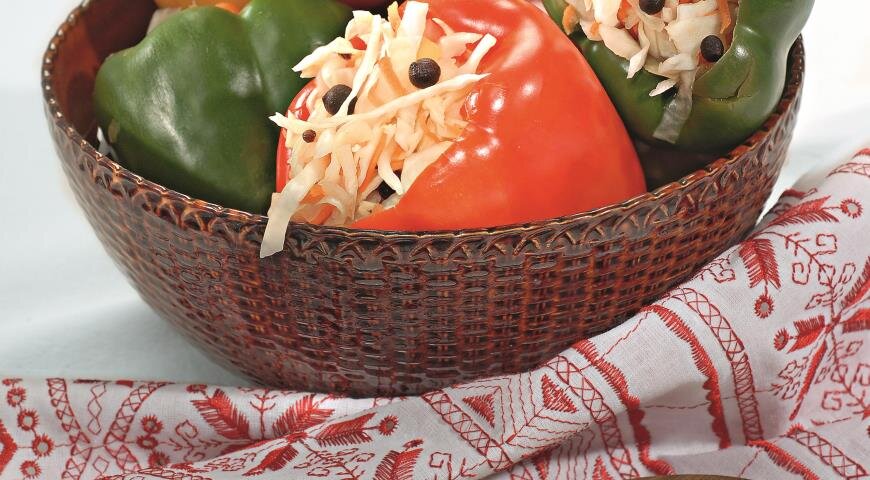 Это блюдо 2 в 1: вы получаете маринованный перец и маринованную капусту сразу. Есть смысл сделать такую заготовку в начале осени, чтобы зимой открыть заветную баночку. ИНГРЕДИЕНТЫ Для маринада ПОШАГОВЫЙ РЕЦЕПТ ПРИГОТОВЛЕНИЯ Шаг 1 Морковь и лук очистить, морковь натереть на крупной терке, лук мелко нарезать. Капусту вымыть, очистить от верхних листьев и тонко нашинковать. Шаг 2 Смешать капусту с морковью и луком, сложить в миску, засыпать 2 ст. л. соли и влить 2 ст. л. уксуса. Оставить на 2 ч при комнатной температуре, время от времени перемешивать. Шаг 3 Сладкие перцы вымыть, срезать верхушку с плодоножкой и удалить сердцевину. Шаг 4 Из острого перчика удалить семена, мякоть измельчить. Кинзу промыть, обсушить и измельчить. Капусту с овощами отжать, смешать с острым перчиком и кинзой и плотно нафаршировать подготовленные сладкие перцы. Разложить по стерилизованным банкам. Шаг 5 Приготовить маринад. Влить в сотейник 1 стакан воды, добавить оставшийся уксус, сахар и соль. На сильном огне