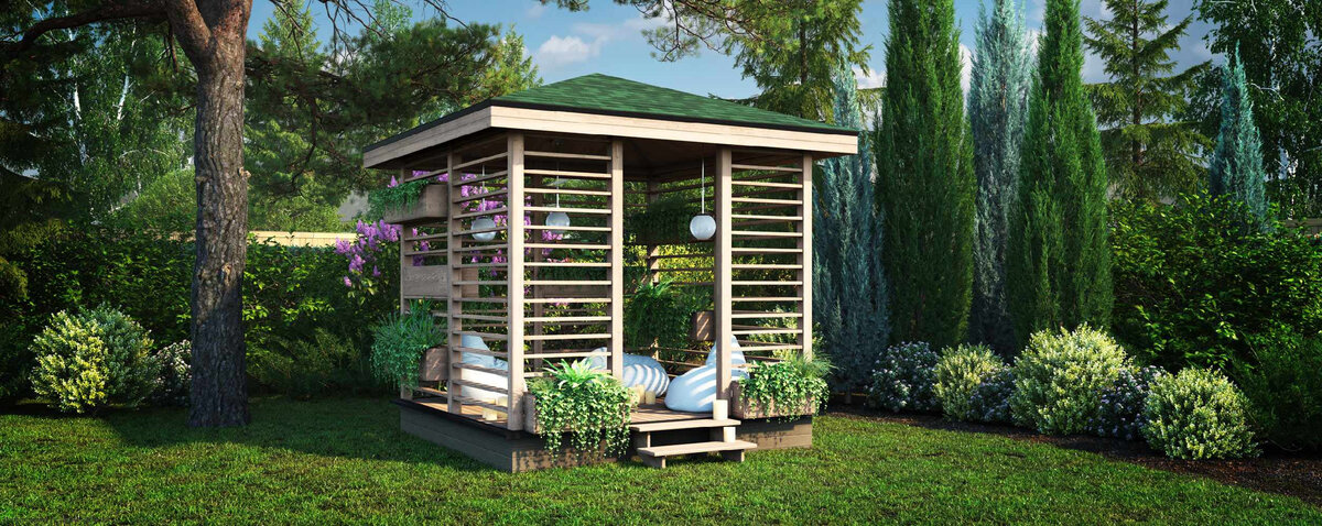 Беседка от компании "ТеремЪ". Площадь застройки: 3 x 3 м. Общая площадь: 9 м2. Стоимость: от 322 000 руб. Комплектация: Под крышу. Кровля: Профнастил оцинкованный