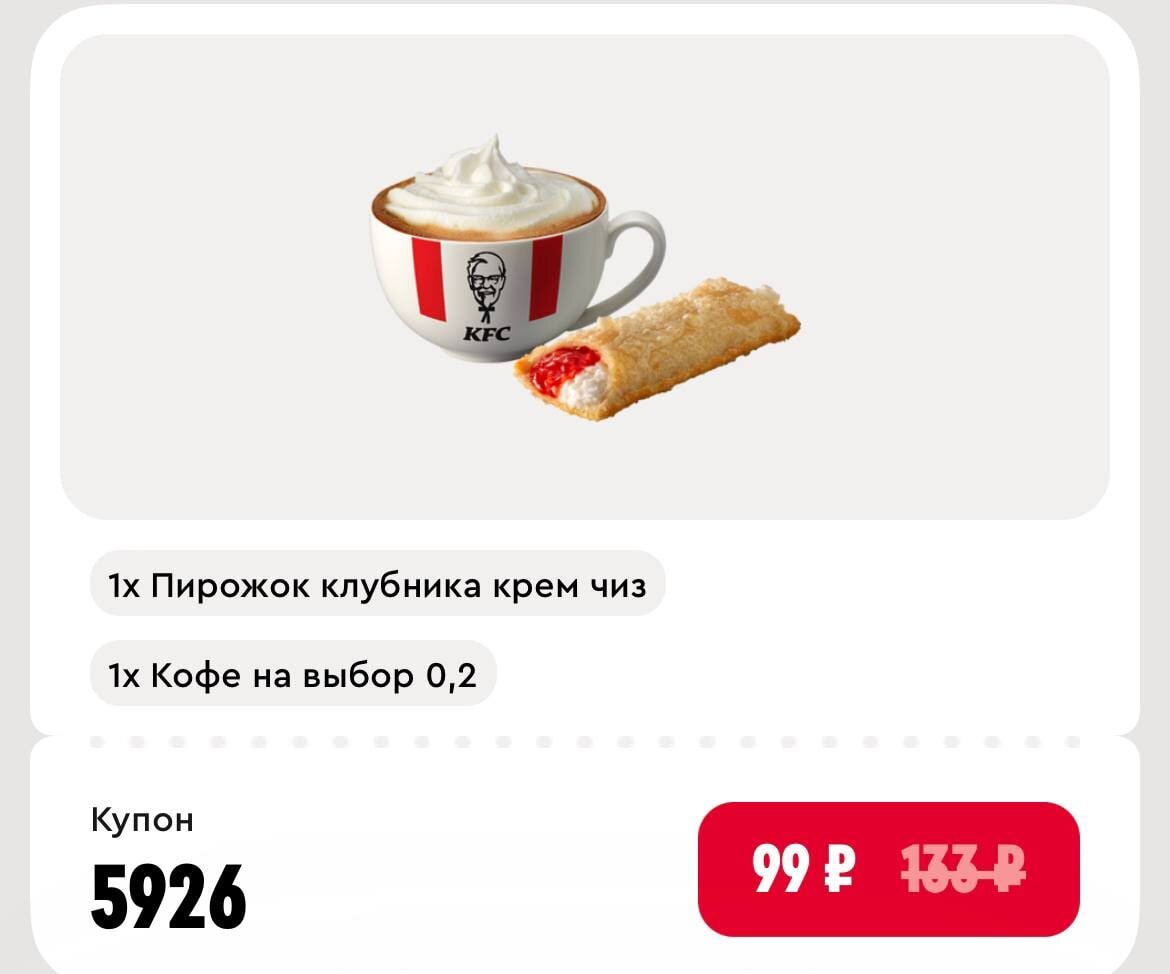 Получаем Кофе 0,2л + пирожок за 99р (вместо 133р) в KFC☕️ 🎁Купон: 5926