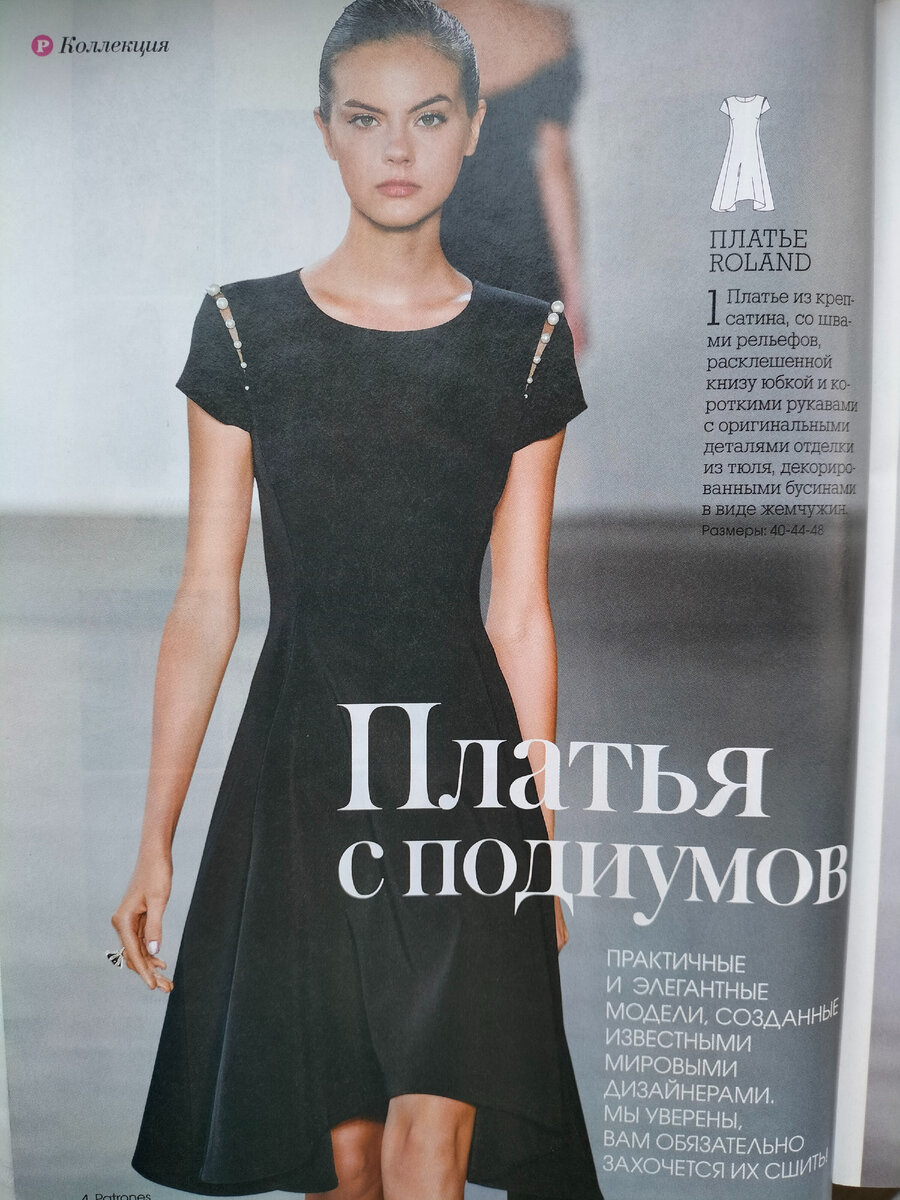 Давно я не кроила по журналам. И вот понравился журнал с дизайнерскими и стильными моделями, купила журнал "Patrones". Раскроила платье, пока без рукавов. (В интернете не нашла похожих снимков. Фото с подиума, но откуда? У модельеров в фамилией Ролан другие платья (Стефан Ролан, Памела Ролан). Ролан Муре? Остальные имена и фамилии известные (Альберта Феретти и др.)) Сетка размеров отличается от бурдовской, как и их количество. На каждую модель выкройка дана в трёх размерах. Также я была озадачена (инструкции заранее не прочитала) тем, что длинные детали, не уместившиеся на лист, обрезаются: в частности нижняя часть юбки вырезается отдельно, соответственно её нужно приклеить к другой части, а кроить вместе. Это не очень удобно и немного запутывает. В советских выкройках в приложении к "Работнице", например, в подобных случаях рисовали стрелку и писали "+40 см" и т.п. Если Вы в первый раз кроите по "Patrones", как и любому другому журналу, предварительно читайте инструкции. Тк