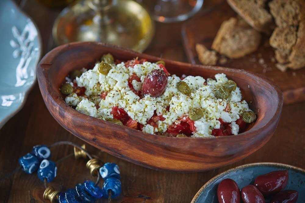 Ингредиенты: Помидоры - 800 гр. Каперсы - 6 ст.л. Сухари ржаные - 180 гр. Масло оливковое 120 мл. Сыр фета - 250 гр. Вино белое сухое - 60 мл. Орегано сушеный - 1 ч.л. Оливки Приготовление: Сухари выложите в пластиковый пакет и раздробите до состояния крупных крошек, используя скалку для теста. Помидоры нарежьте мелким кубиком, фету разомните вилкой. Выложите в салатник раздробленные сухари, полейте белым вином и сбрызните оливковым маслом, перемешайте. Поверх сухарей выложите нарезанные помидоры вместе с выделившимся соком, раскрошенную фету и каперсы, полейте оливковым маслом и посыпьте орегано, украсьте салат оливками. Приятного аппетита!