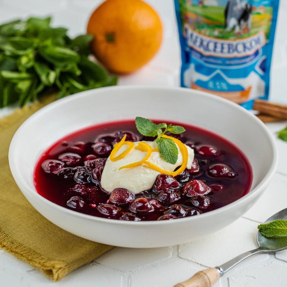 1. Для приготовления мусса измельчить цедру апельсина на терке. Творог, сгущённое молоко и цедру смешать в чаше. 2. Из черешни удалить плодоножки и косточки. Воду налить в сотейник, поставить кипятить. Добавить сахар, разломанные палочки корицы и черешню в кипящую воду. Варить при сильном кипении 2-3 минуты, аккуратно перемешивая, сохраняя ягоды целыми. 3. Снять с огня, перелить суп в тарелки, в центр положить творожный мусс. Украсить блюдо мятой и цедрой апельсина. Приятного аппетита! #алексеевское #сгущенное молоко #сгущенка #летний суп #черешня #мусс
