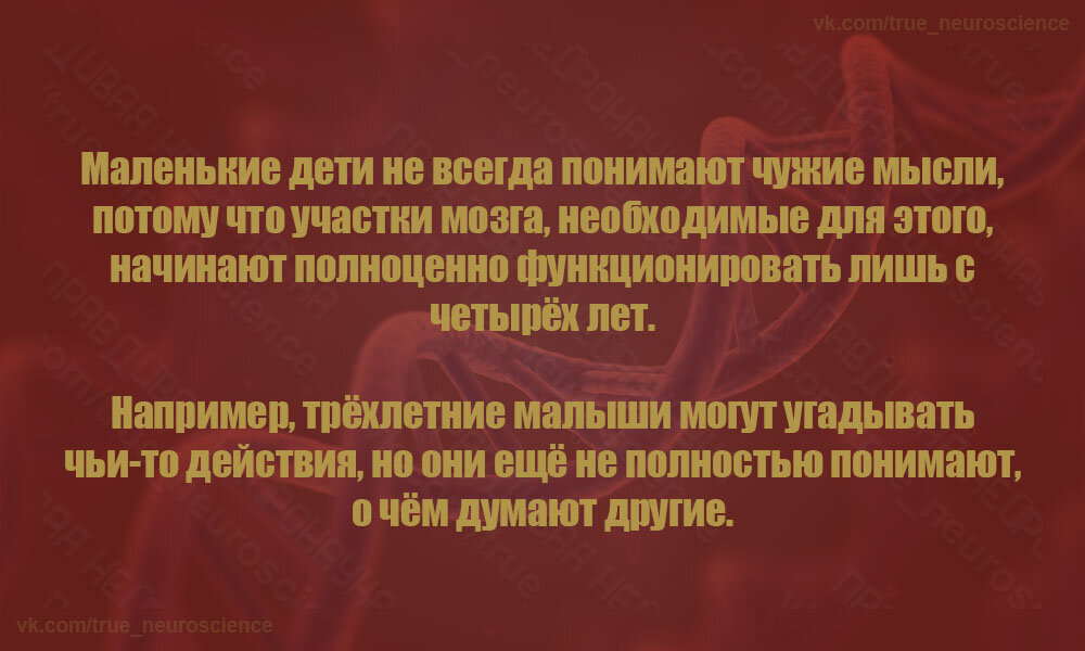 Маленькие дети понимают чужие мысли не во всяком случае, так как участки мозга, которые нужны для этого, полноценно работают с возраста 4 года. Например, трёхлетние малыши способны угадывать действия другого человека, но они при этом ещё не в полном объёме понимают, о чём думают другие. Источники: