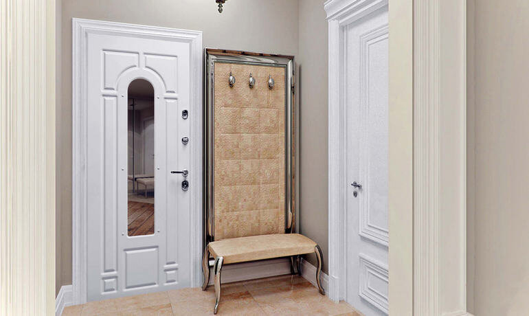 Когда все двери, мебель и декор в комнате выдержаны в едином стиле, пространство выглядит целостно и стильно. Смотрите идеи комплексных решений для классической и современной прихожей и реализуйте у себя в квартире или доме. Для классического интерьера Все двери и шкаф выполнены в белом цвете с одинаковым декором: прямоугольной фрезеровкой, фактурной филёнкой, поэтому выглядят как единое целое. Светлая отделка полотен освежает интерьер и визуально увеличивает пространство прихожей. Двери в тёмном оттенке под дерево с традиционной фрезеровкой привносят аристократизм в интерьер. Межкомнатные модели дополнены объёмными капителями, которые ещё больше подчёркивают классический стиль пространства. Покрытие SteelLak Protect входной двери сочетается с текстурой эмали межкомнатных дверей, объёмная фрезеровка перекликается с фигурными филёнками и стеклянными вставками. Дверные полотна одного цвета сохраняют единый стиль в комнате. В современную прихожую Сдержанный дизайн дверных полотен и фурнит