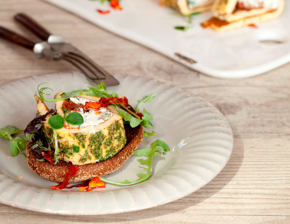 - Для начинки смешайте брынзу со сметаной, мелко рублеными томатами, чесноком, каперсами и зеленью. Получившуюся начинку выложите на омлеты и аккуратно заверните в неплотные рулеты.