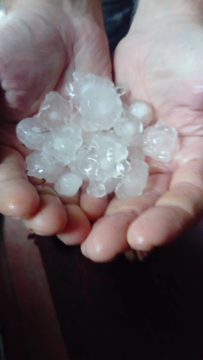 Сегодня по прогнозу дождь обещали с 7.00 до 13.00. Он был, чуть смочил землю и закончился. Вечером без осадков. Небо было ясное до 19.00, потом тучки, потом слабый дождь, потом усиление ветра, а потом вот это! Этот залетел на крыльцо. Выйти посмотреть, что во дворе, не осмелились. Шум по крыше был такой, что было жутковато. Когда всё стихло пошли смотреть последствия. Как ни странно ничего не повредил, даже цветы не покалечил. Вот остатки града. Крупный, но редкий! Такого крупного града у нас ещё ни разу не было. И сразу солнце! Вот так бывает.