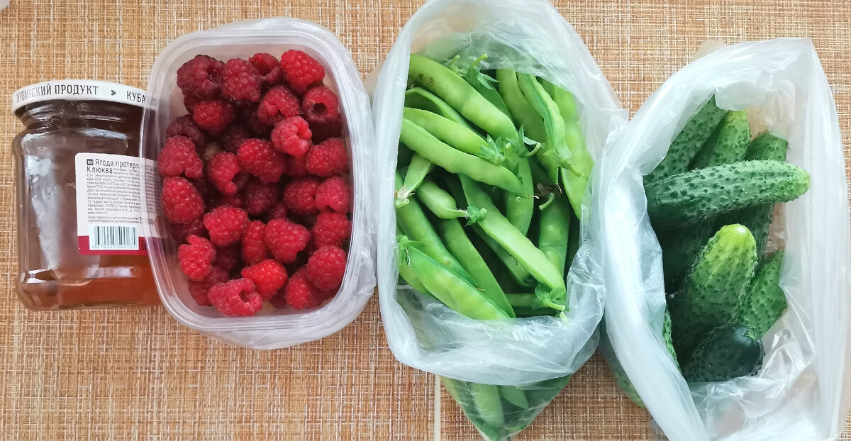 Добрый вечер, друзья! 🤗 Смотрю ленту Дзена, все выкладывают фото своего урожая🍓🥒🍅🧄🍒 А мы тоже не лыком шиты! 😜😄 Сегодня приходила моя бабушка в гости (детишкам прабабушка), принесла нам вкусняшек из своего огорода 😋 В баночке изумрудное варенье из крыжовника, малина белая и красная, горох, огурцы. Малинку дети съели почти мгновенно 😅 Я тоже попробовала несколько ягод. А белая какая сладкая! Ммм...) Огород у них большой, около 10 соток земли, не считая дома и хоз.построек. Может быть для кого-то это немного, но они люди пожилые, и тем не менее держат огород. Выращивают всё, что хорошо растёт в нашей полосе: картошку, лук, морковь, свёклу, огурцы, помидоры, перцы, капусту, кабачки, подсолнухи. Также имеются плодовые деревья: груши, яблони, вишня, слива🍐🍏🍒 Из меня помощник никудышный, мы с детьми сидим в квартире. Гулять ходим на площадку. Настюша ещё спит два раза в день, и только в своей кроватке ☺️ Поэтому далеко никуда не ходим, а живём друг от друга далековато, не ближ