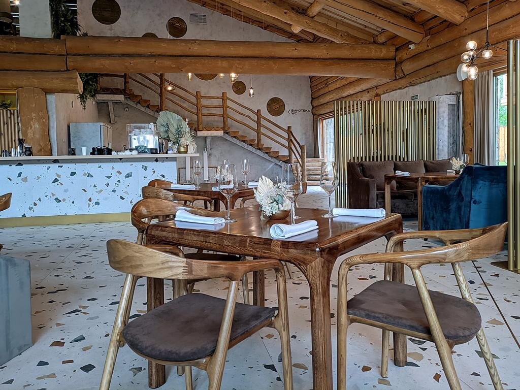 Большой ресторан: с первого этажа, где парковка и «пульт» хостес, поднимаешься и пока не понимаешь масштаб. Огромный, дышащий, живой от дерева зал, веранда, еще и винотека на втором ярусе с двумя огромными шкафами — только она площадью в два «Тартарбара». Наверху, кстати, второй набор туалетов, что важно при таком размахе пространства.