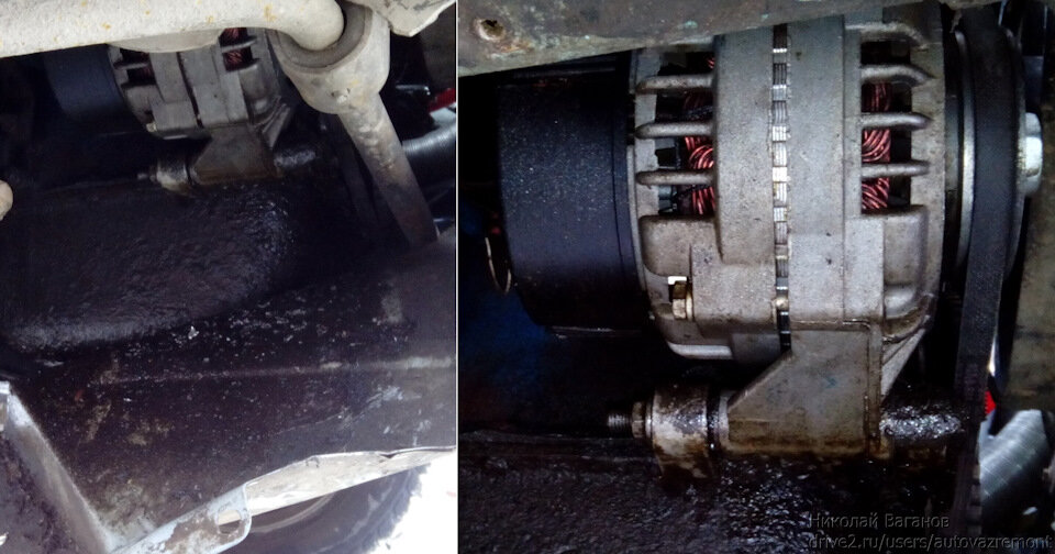 Отогнул брызговик — генератор был полностью в масле, хотя сверху это и не так заметно.