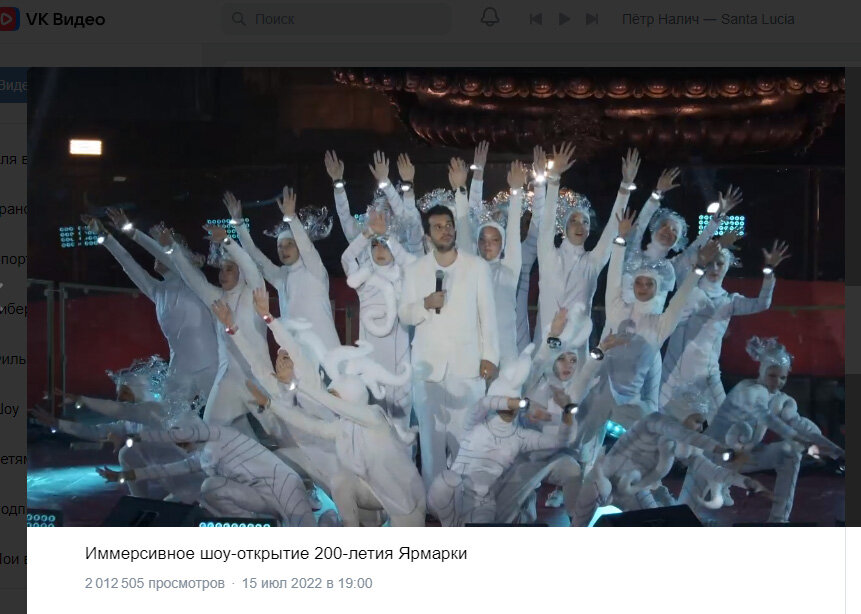 Упомяну одно очень интересное событие, которое я смотрела в трансляции: открытие Нижегородской ярмарки. В честь ее 200-летнего юбилея было показано музыкальное шоу, сделанное Ильей Авербухом; почему-то оно называлось иммерсивным, но по сути это был большой концерт на площади с параллельными выступлениями акробатов, танцоров, выездом конных экипажей, «росписью» светом фасада исторического Главного ярмарочного дома, и т.д., и т.п. Высоко над сценой можно было заметить даже канатоходца. А завершалось всё это великолепие еще и масштабным фейерверком. Я, честно говоря, стала смотреть, потому что в шоу был заявлен Петр Налич. Пел он всего одну песню под минус, причем неожиданно выбор пал на «Сампо». Можно было забеспокоиться, как такая своеобразная, эстетская, фантазийная и музыкально непростая композиция впишется в ярмарочный формат, с его частушками да скоморохами. Оказалось, превосходно вписывается, если грамотно подать. Оформлено выступление оказалось очень интересно. Вообще некоторый на