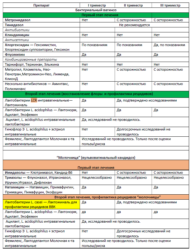 Бактериальный вагиноз и кандидозный вульвовагинит – самые частые спутники беременных. По статистике от этих вагинальных инфекций страдает каждая третья женщина, ожидающая ребенка. Однако при всем многообразии препаратов использовать при беременности можно далеко не все. Вот список разрешенных лекарственных средств в первом, втором и третьем триместрах. В таблице приведены схемы в рамках двухэтапной терапии, рекомендованной Российским обществом акушеров-гинекологов (РОАГ) 1 этап – лечение инфекции, 2 этап - восстановление микрофлоры для профилактики рецидива заболевания. Данные приведены согласно инструкциям по применению и научным исследованиям.