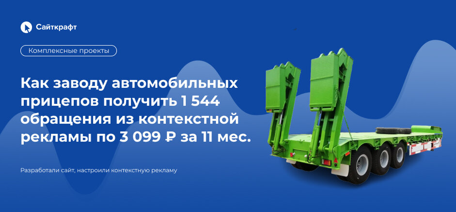 Клиент: Машиностроительный завод автомобильных прицепов с 80-летней историей и оборотом более 1 000 000 000 ₽ в год Цель и задачи агентства: Настроить контекстную рекламу, которая будет давать обращения и продажи Больше кейсов найдете по ссылке. Содержание кейса 01 Задачи агентства 02 Сложности и особенности проекта 01 Крупный заказчик, который не захотел раскрывать данные. Поэтому кейс безымянный.