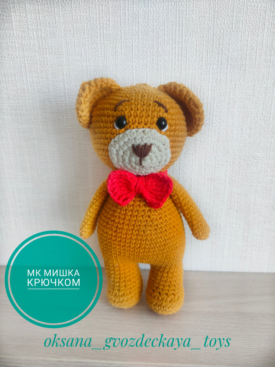 Добрый день 🥰 Предлагаю связать такого замечательного мишку♥️ Нам понадобится: Пряжа-(можно использовать любую) alize cotton gold цвет 83 Yarnart jeans цвет 05 (для мордочки) Yarnart jeans цвет 70(для носика) Yarnart jeans цвет 26(для бабочки) Крючок у меня 1,75мм Наполнитель Начинаем вязать: Голова 1ряд-6сбн в ка 2ряд-6приб (12) 3ряд-(1сбн,пр)*6(18) 4ряд-(2сбн,пр)*6(24) 5ряд-(3сбн,пр)*6(30) 6ряд-(4сбн,пр)*6(36) 7ряд-(5сбн,пр)*6(42) 8ряд-(6сбн,пр)*6(48) 9ряд-(7сбн,пр)*6(54) 10-17ряд-54сбн(7рядов) 18ряд-(7сбн,уб)*6(48) 19ряд-(6сбн,уб)*6(42) 20ряд-(5сбн,уб)*6(36) 21ряд-(4сбн,уб)*6(30) 22ряд-(3сбн,уб)*6(24) Глазки прикрепляем между 11 и 12 рядами Мордочка (Вяжем бежевой нитью) 1ряд-6сбн в ка 2ряд-6пр(12) 3ряд-(3сбн,3пр)*2(18) 4ряд-((1сбн,пр)*3, 3сбн)*2(24) 5ряд-((2сбн,пр)*3, 3сбн)*2(30) Оставить нить для пришивания, не набивать Ушки 1ряд-6сбн в ка 2ряд-6пр(12) 3ряд-(1сбн,пр)*6(18) 4ряд-(2сбн,пр)*6(24) 5-6ряд-24сбн 7ряд-(6сбн,уб)*3(21) Оставить нить для пришивания, не набивать Ручки 1р
