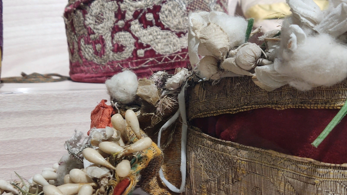 Советским девочкам мамы на Новый год делали короны, которые украшали ватками, имитирующими снег, и мелким блестящим стеклом от разбитых елочных игрушек, которые заставляли этот снег сверкать, будто на солнце. Такие самодельные короны мне вспомнились, когда я рассматривала этот чудесный головной убор в Национальном музее Карелии. Это девичья повязка ("перевязка", "лента"), которую носили прионежские карелки/людики. Конкретно этот головной убор в музей попал из села Шуя, Петрозаводского уезда, Олонецкой губернии. Изготовлен он в конце 19 века. Богатая фантазия была у мастерицы, которая его делала. И хоть это не единственный такой пример: подобные перевязки носили разные девушки, однако, это не было очень распространенным украшением. Интересно вообще, кто придумал впервые подобные аппликации на перевязках, имитирующие настоящие цветы, капли воды. Кто-то с неординарным мышлением. Конструкция перевязки такая: Основа – проклеенные листы бумаги (папье-маше). Лицевая сторона обтянута бархато