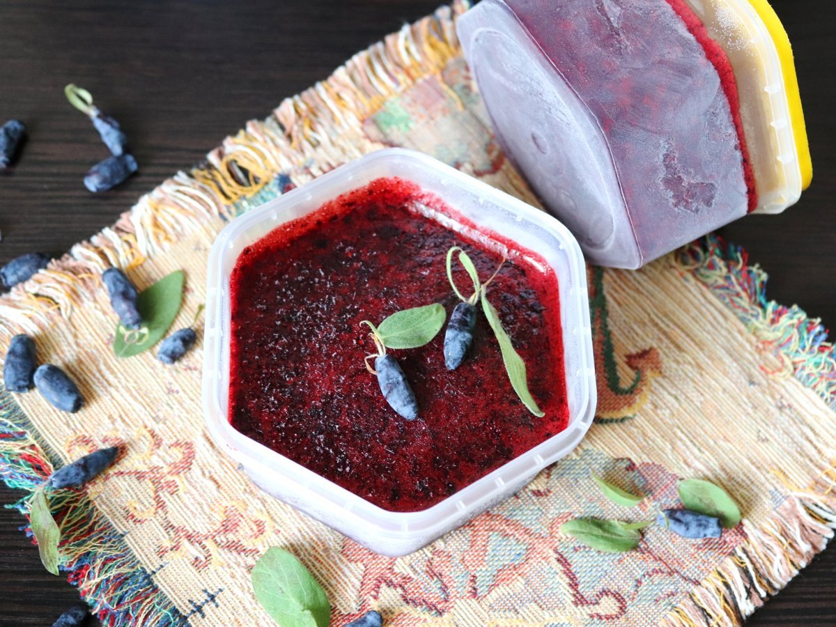 Жимолость - сочная, терпкая и очень полезная ягода, одна из самых первых ягод лета. Для заготовки впрок из неё варят варенье, замораживают целыми ягодами. Я предлагаю приготовить ягодное пюре и заморозить в таком виде в контейнере. А зимой из такой заготовки можно приготовить десерты, напитки, можно добавить к мороженому или подать к чаю просто так.