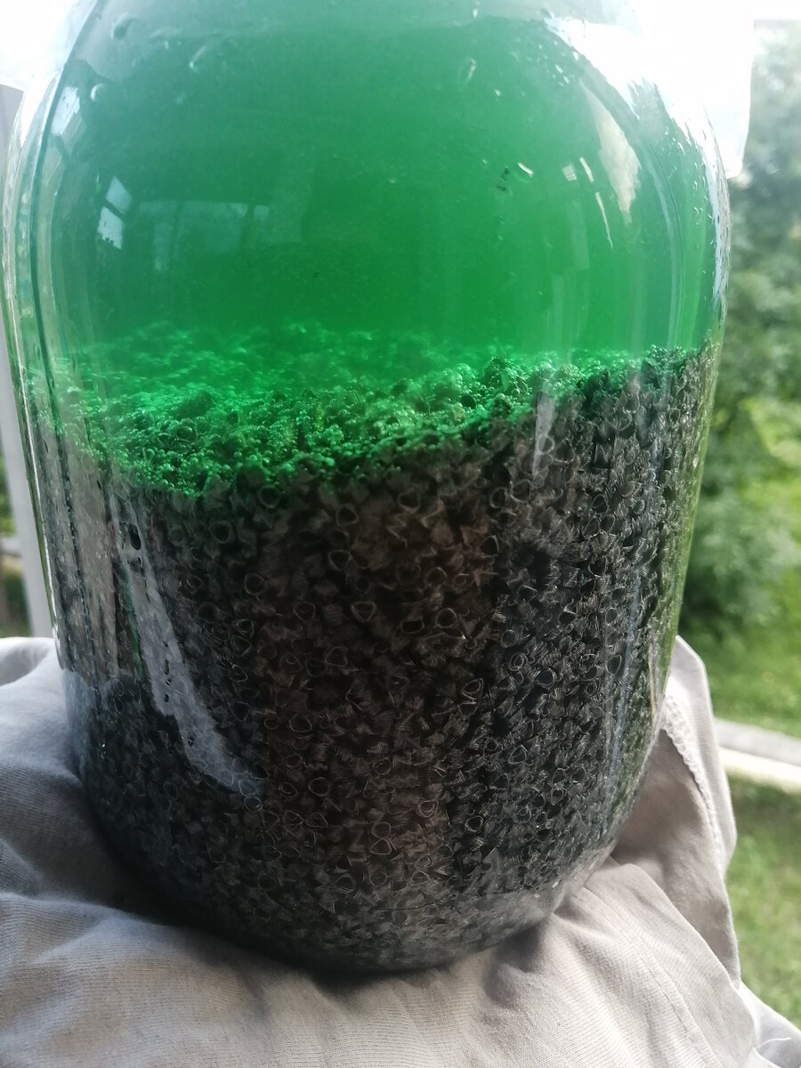 Реакция начинается практически сразу. Жидкость зеленеет, а насадка темнеет/сереет и теряет свой изначальный блеск.