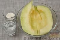 Пошаговый фото рецепт: Подготавливаем продукты для дынной граниты. Дыню очищаем. Сахар смешиваем с водой, ставим на медленный огонь, доводим до закипания. Снимаем сироп с плиты, даём остыть до комнатной температуры. Дыню нарезаем средними кусочками (примерно по 5 см.) Выкладываем кусочки дыни в чашу блендера и измельчаем в пюре. В морозоустойчивой форме соединяем дынное пюре с остывшим сиропом. Перемешиваем. Отправляем в морозилку на 30-40 минут. Достаём форму, вилкой хорошо перемешиваем прихватившуюся дынную массу. Снова отправляем в морозилку на 30 минут. Повторяем процедуру перемешивания и подмораживания каждые 30-40 минут. Когда жи