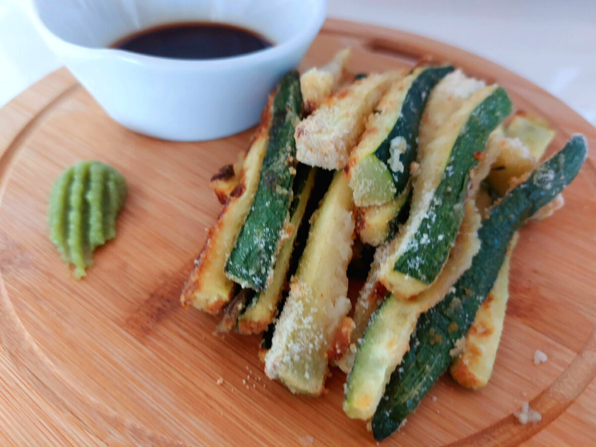 Не знаю как вы, а я постоянно "на диете" и постоянно в поиске рецептов с овощами. Чтобы обед был не только полезеным и малокалорийным ("относительно"), но ещё желанным и вкусным. ИНГРЕДИЕНТЫ: цукини - 400 гр.; чеснок - 1/2 крупного зубчика; мята - 4 листика; панировочные сухари - 50 гр.; оливковое масло - 20 гр. соль - 5 гр. РЕЦЕПТ: 1 - Цукини помыть, обрезать края и продольно нарезать ломтиками толщиной 0,5 см. 2 - Ломтики нарезать на брусочки также толщиной 0,5 см. 3 - Мелко порезать чеснок и мяту. Что касается чеснока и мяты, то я положила как по-рецепту. Но на самом деле, думаю, что можно и по вкусу. Например, в следующий раз я положу чуть больше чеснока (люблю аромат "чеснока из духовки") и, возможно, на пару листиков мяты побольше. + в следующий раз не нарежу чеснок, а выдавать через чеснокодавку. Думаю, так будет лучше. 4 - Положим цукини в миску, добавим соль, мяту и чеснок и все перемешаем. 5 - добавим панировочные сухари и опять тщательно перемешаем. Каждый ломтик должен б
