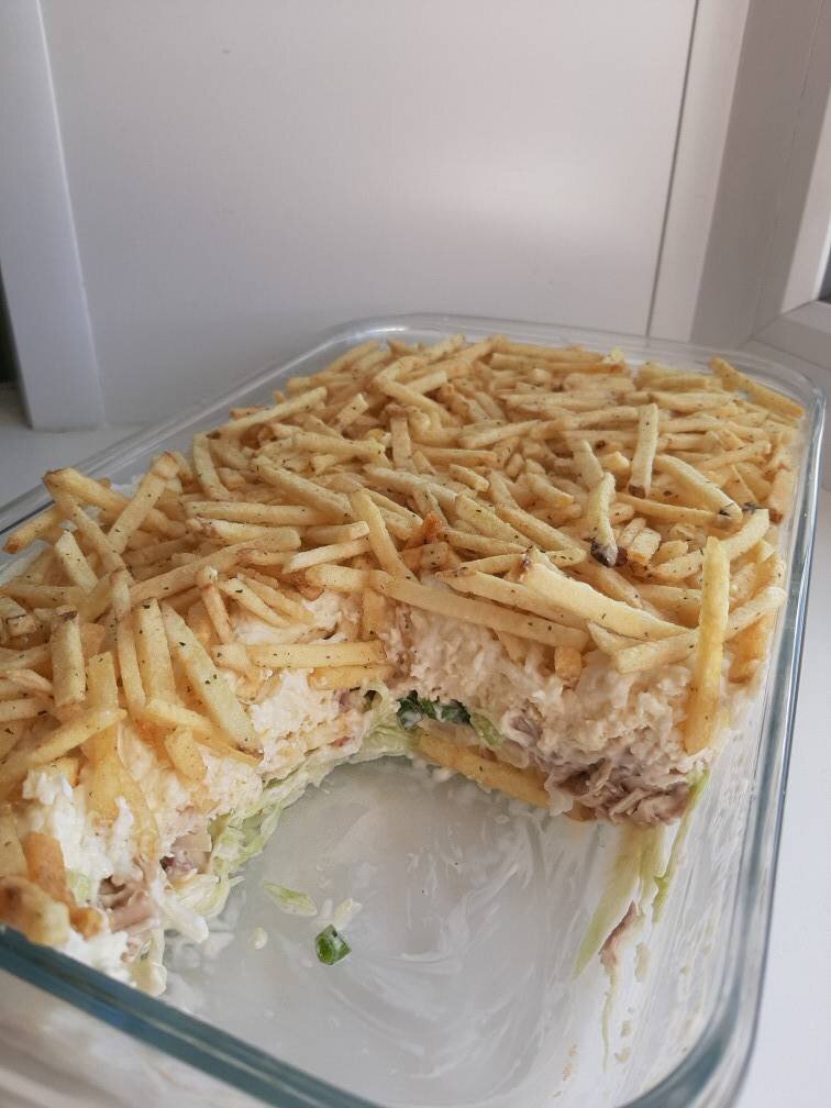 Попробовала такой салат в Магните, решила повторить #салат #салатарабский #слоеныйсалат Ингредиенты: Капуста б/к, Лук зелёный, Курица вареная, Сыр, Яйца, Картофельная соломка, Майонез Способ приготовления: Салат выкладываем слоями: 1 слой: капуста мелко нашинковать, майонез 2 слой: зелёный лук мелко порезать 3 слой: курица вареная Майонез 4 слой: сыр на мелкой тёрке Майонез 5 слой: яичная масса (варёные яйца натереть на мелкой тёрке и смешать с майонезом) Сверху посыпать картофельной соломкой (можно приготовить самим, но проще купить готовую) Приятного аппетита