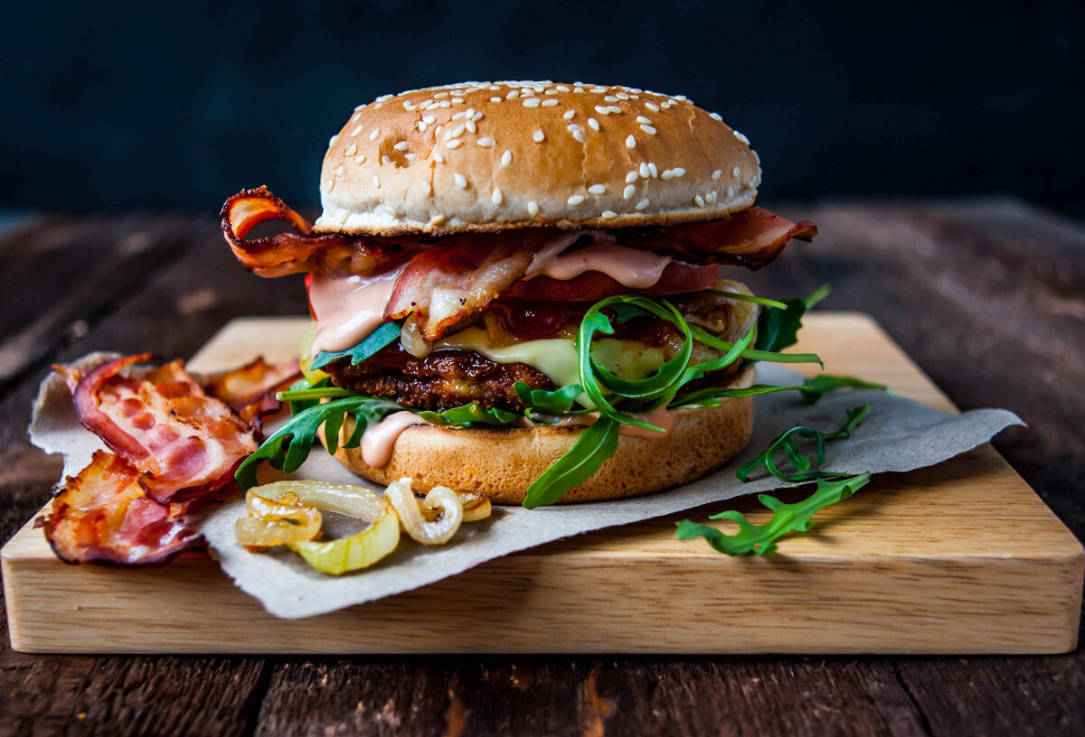 Быстро поджариваем бекон и булочки в последнюю очередь, чтобы бургер был максимально горячий и вкусный.