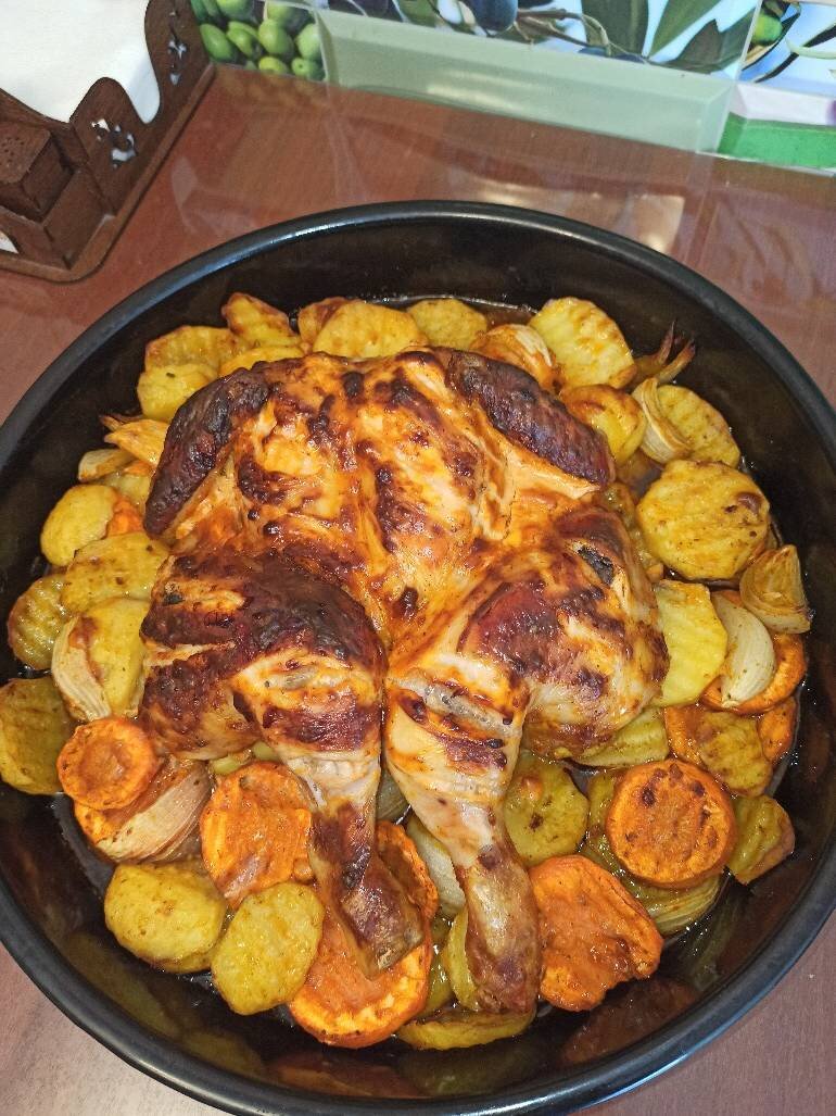 Рецепт простого и сытного ужина. Ингредиенты: Курица, Маринад, Сметана/майонез , Томат паста , Раст масло , Чеснок, Паприка/чёрный перец/ соль , Овощи (можно любые), Картофель, Лук, Морковь, Раст масло, Копчёная паприка/ чёрный перец/ соль Способ приготовления: Тушку моём, обрезаем кончик крыла и хвост. Разрезаем по спинке и делаем надрезы. Для маринада смешиваем все ингредиенты. Промазываем всю тушку и оставляем минимум на 30 мин. Овощи моём, чистим и режем. Добавляем специи, раст масло, перемешиваем и выкладываем на противень. Кладём сверху курицу и отправляем в духовку на 1 час 20 мин при 200°С.