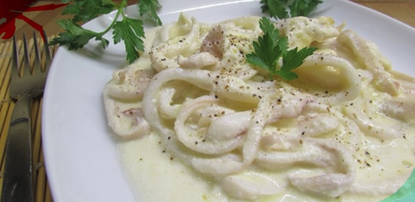 Рецепт: Тушки кальмаров в соусе из сметаны и зиры