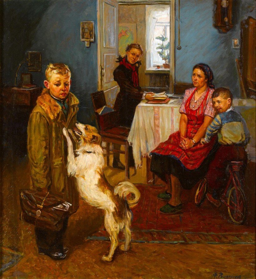 Мальчик пришел из школы, причем задержался, боялся идти домой. Его сестра тоже школьница судя по всему уже давно дома, успела раздеться ти даже наверное поесть, а он болтался по улицам никак не находя сил, чтобы прийти и получить очередную выволочку. Мама с грустью глядит на него, наверное, давно смирившись с тем, что сын двоечник, ни к чему не способен и совсем пропащий. Младший брат с ехидством и радостью смотрит на него, теперь то достанется брату а не ему за съеденное варенье. И только собака бескорыстно радуется приходу любимого хозяина.