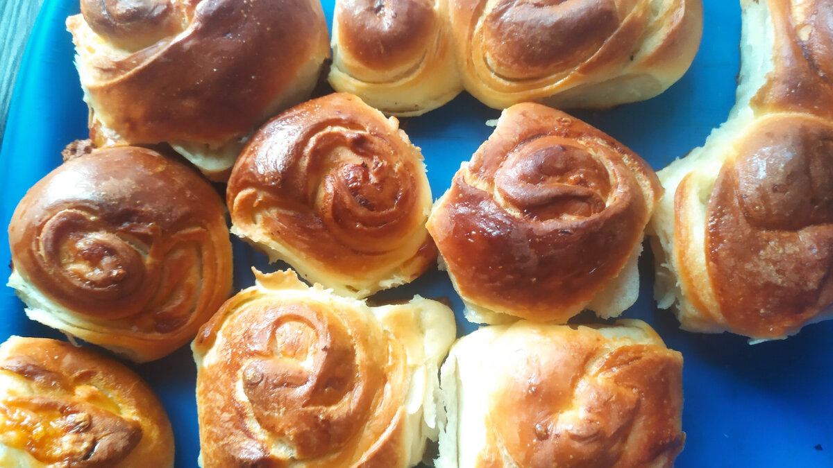 Часто готовлю булочки к чаю. Эти - одни из самых любимых. Булочки воздушные, с сырной начинкой и очень ароматные, так как готовятся со сливочным маслом. Для теста: Для начинки: Как готовить: 1. Замесить тесто. В миску влить тёплое молоко и воду, добавить белок, соль, сахар, растительное масло, сухие дрожжи. Всё перемешать. Всыпать просеянную муку. Тесто получается мягкое, не липнущее к рукам и рабочей поверхности. 2. Накрыть миску пищевой плёнкой и оставить минут на 40. 3. Сыр натереть на тёрке. У меня на крупной, вы можете потереть на мелкой. Здесь дело вкуса! 4. Сливочное масло растопить. 5. Когда тесто хорошо подошло, перекладываю его на стол, присыпанный мукой. Формирую из него шар. Теперь делю этот ком на 4 части, приблизительно одинаковые по размеру. Каждую из четырёх частей делю ещё на 4 равные части, из которых формирую комочки, вот так: Беру один комочек теста и тонко его раскатываю. Стол обязательно присыпаю мукой. Стараюсь раскатать тесто как можно тоньше. Беру ещё один кус