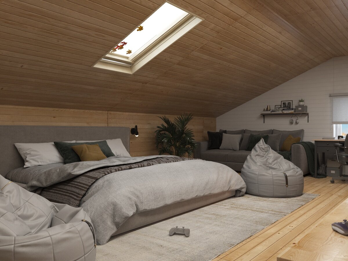 Сегодня я расскажу вам об одном из таких проектов - мансардной комнате в частном доме для молодого человека! Главные пожелания - натуральное дерево в отделке, большая кровать, огромный телевизор для игр в приставку и место для занятия спортом 😎
