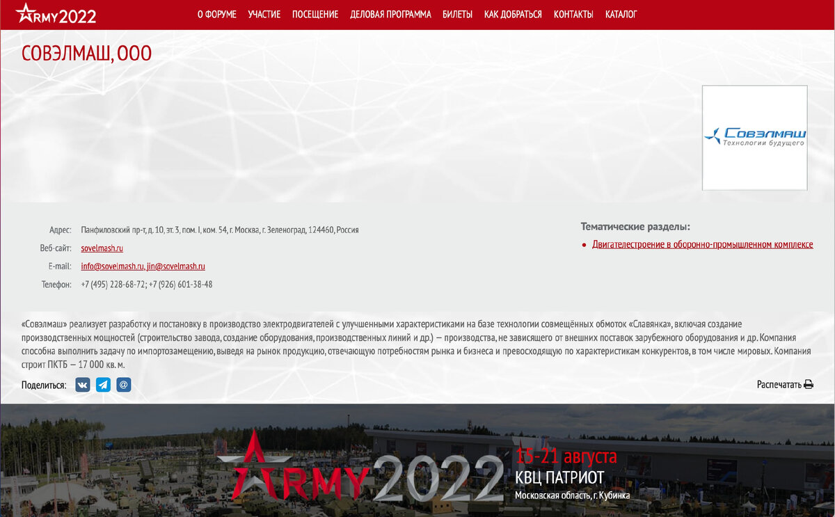 Теперь на официальном сайте Форума «АРМИЯ-2022» можно найти информацию о компании «Совэлмаш».