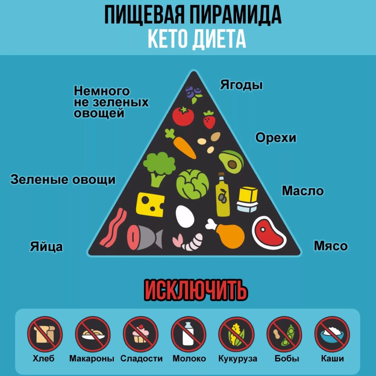 Основа кето-диеты – это низкоуглеводные продукты с небольшим содержанием белка и повышенным содержанием жира. Такое питание постепенно вводит организм в кетоз – состояние при котором печень начинает вырабатывать органические вещества вместо глюкозы. То есть вырабатывается энергия для полноценного функционирования организма.