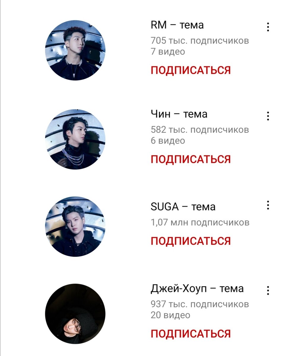 На Ютубе появились личные каналы каждого участника группы BTS, на каждом канале есть личные проекты, которые они ранее публиковали. Они созданы автоматически, но они есть в разделе "Каналы" на Ютуб канале "BANGTANTV. (на официальном их сайте) Вот ссылочки на их каналы: Намджун (RM) - https://www.youtube.com/channel/UCobdGaP9wpoF4Pp_sWAEWXw Джин (Jin) - https://www.youtube.com/channel/UCkX4rp22PPv7V6PKXD7zZFg Юнги (Suga) - https://www.youtube.com/channel/UC2QGq7pv-ZfZfTL8tcn2fNg Хосок (J-Hope) - https://www.youtube.com/channel/UChLNWcjgBfZ9RPnzR5LM1mQ Чимин (Jimin) - https://www.youtube.com/channel/UCE6l2NHQkpgF_P96isfOu4Q Тэхен (Taehyung/V) - https://www.youtube.com/channel/UCfy7if7UC_8PGHzTqdefMmw Чонгук (Jingkook) - https://www.youtube.com/channel/UC-pOuHFcndLpyfWSPVqXt_A Причем дата регистрации страницы у них у всех в разное время, например у Намджуна - Дата регистрации: 26 окт. 2018 г. Джина - Дата регистрации: 24 окт. 2018 г. Юнги - Дата регистрации: 21 мая 2018 г. Хосока - Дата