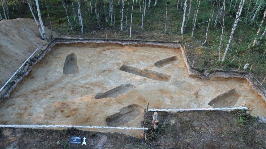 Вместе с захоронением ребенка также были найдены погребения взрослых. Фото: arctic.yanao.ru Археологи обнаружили в средневековом могильнике «Нюрымпосллор-4» в Приуральском районе Ямало-Ненецкого автономного округа необычную мумию ребенка. Соответствующее сообщение появилось на сайте научного центра изучения Арктики. Находка примечательна тем, что лицо ребенка было покрыто целиком серебряными пластинами и фольгой. Специалисты предполагают, что именно серебряная маска и стала причиной мумификации ребенка. «В детском погребении было обнаружены мумифицированные останки тканей и волос ребенка, в частности головы», — отметил руководитель экспедиции Александр Гусев. arctic.yanao.ru Полевые работы проводились на памятнике с 15 июня по 15 июля. За это время археологи раскопали территорию площадью 55 квадратных метров, обнаружив семь детских и взрослых захоронений. В первом погребении был обнаружен младенец, умерший вскоре после появления на свет. Ранее 5-tv.ru писал о том, что кладбище слонов и