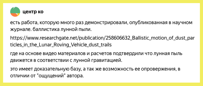 Правда, никакой "научности" в статье нет вообще. Никто ведь ещё ни разу не видел, как из-под колёс лунохода на большой скорости вылетает пыль. Что советские луноходы 50 лет назад, что китайский 9 лет назад, двигались очень медленно. Поэтому мы имеем лишь предположение, как должна себя вести пыль, выброшенная на Луне. Вот если бы в статье было сравнение реально заснятого разлета пыли на Луне с разлётом, показанном на проезде ровера в сериале "Аполлон-16", то вот такая статья могла бы представлять интерес и могла бы быть опубликована в журнале "Америкэн синематографер".