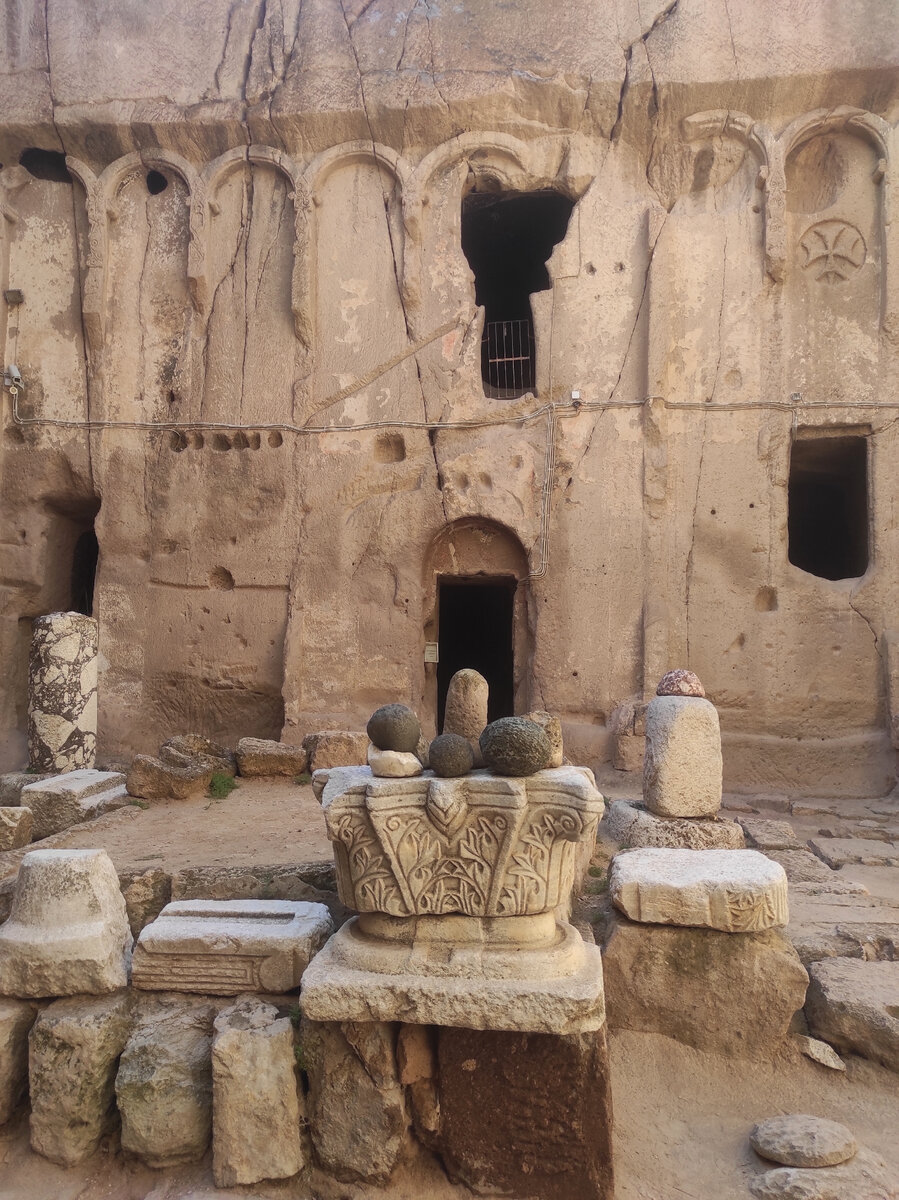 Начинаем исследовать Каппадокию с монастыря Гюмюшлер. Высеченный в скале монастырь Гюмюшлер находится вдали от основного туристического маршрута в 10 км от города Нигде. В переводе на русский язык название монастыря означает старое серебро. Монастырь Гюмюшлер – один из самых больших и хорошо сохранившихся в Каппадокии. Монастырь простирается на 1,5 км. Предполагают, что монастырь был построен после 6 в., а фрески относятся к 11-12 в. Центральный монастырский двор целиком вырублен в скале. Из двора прорыты разные пещеры, в том числе и пещера, в которой расположена церковь. Ниже уровня двора тянется сложная сеть подземных келий, снабженная сетью вентеляционных шахт. Помимо монастырских келий и церкви можно различить кухню, столовую, склад для продовольствия, различные резервуары для храния масла и вина. Повсюду в полу различимы склепы для захоронений, а в стенах выдолблены множественные ниши для хранения различных предметов, в том числе ритуальных. Монастырь Гюмюшлер был открыт только