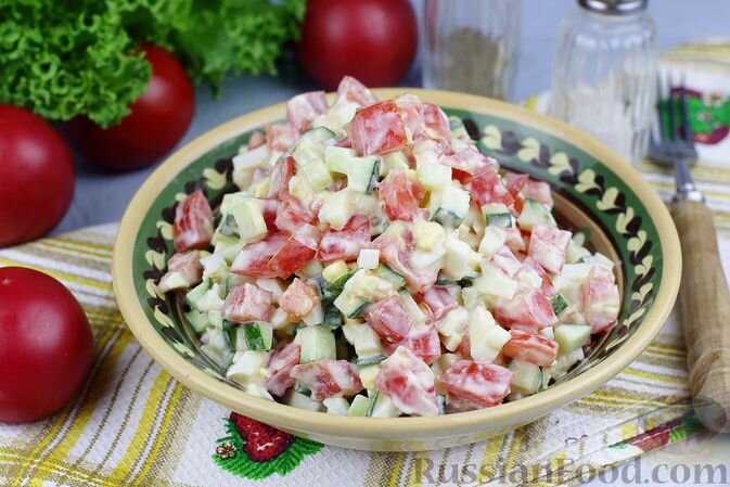 Салат из помидоров, огурцов и яиц. Салат с ветчиной, ананасами и сыром. Салат "Муравьиная горка" с языком и баклажаном. Салат с капустой и тунцом. Салат с курицей, кабачком и авокадо. Салат с ветчиной, ананасами, кукурузой, сыром и морковью по-корейски. Продукты, входящие в его состав, уже готовы к употреблению, поэтому на приготовление этой чудесной закуски уйдёт всего минут десять. Все ингредиенты отлично сочетаются друг с другом, салат получается пикантным, с интересным пряно-сладким вкусовым оттенком. Салат "Муравьиная горка" с языком и баклажаном очень эффектно смотрится на праздничном столе. Обжаренные с луком баклажаны и варёный язык выкладываются горкой, украшаются горчицей и тонкими ниточками майонеза. Салат из молодой капусты с тунцом, зелёным горошком и яйцами. Хрустящая капуста отлично сочетается с кусочками рыбы, вареными яйцами и горошком. Заправляется салат лимонным соком и растительным маслом. Можно использовать масло, оставшееся от консервированной рыбы. Салат с куриц