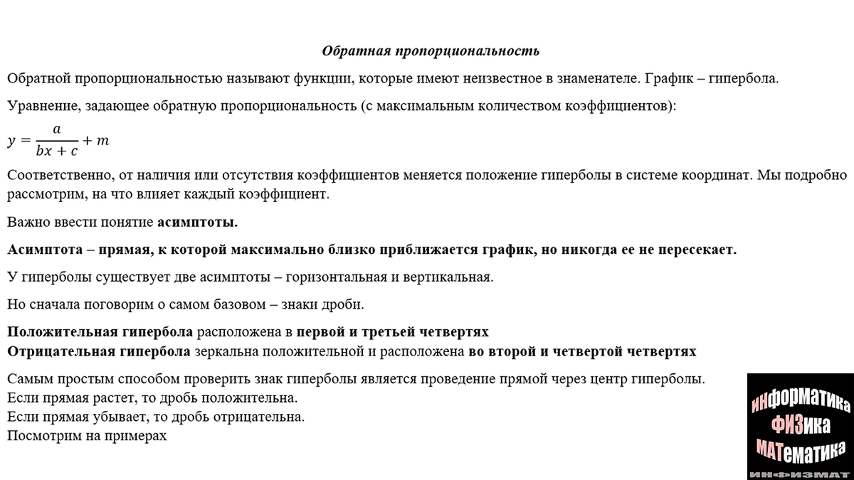 Обратная пропорциональность. Теория. Поведение гиперболы в зависимости от коэффициентов. Асимптота. Подробный разбор на примерах.