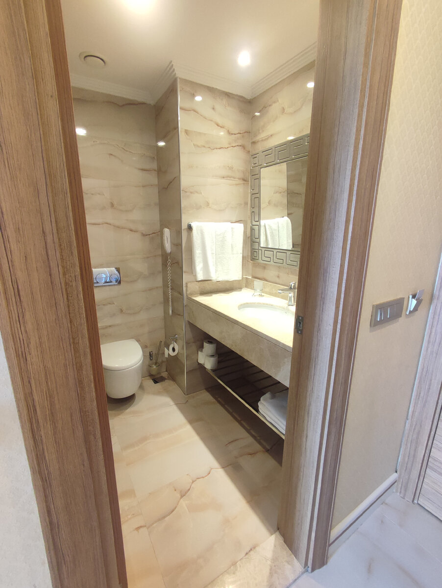 Санузел отделан камнем. Камень в Турции это местный дешёвый материал. Камнем тут всё отделывают не стесняясь. Красиво и практично. Весь отель как дворец в камне. Отделка в стиле турецкого барокко - Дорого богато. Статуи всякие на фасадах. Круче чем у наших армян в Адлере.