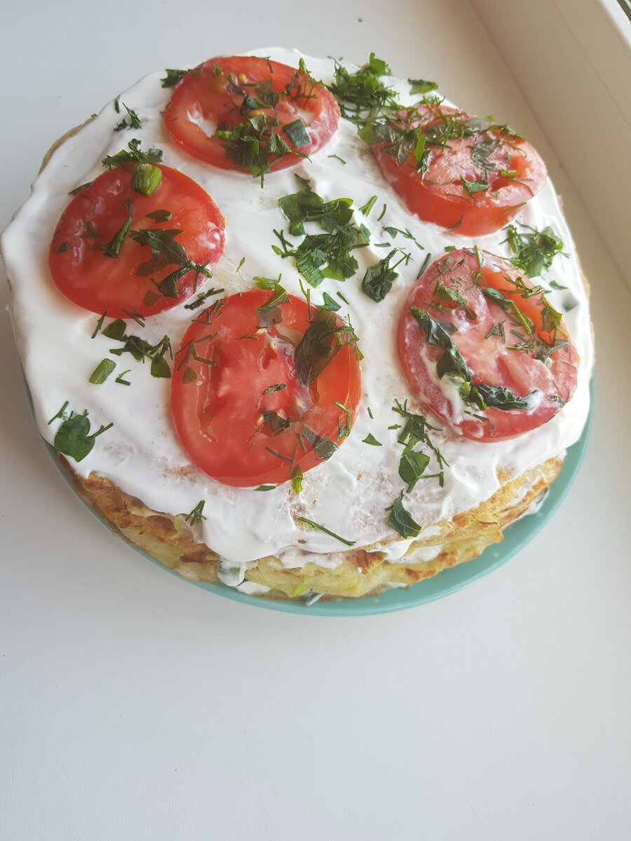 Всем привет, вот и наступил сезон кабачков, я впервые решила сделать кабачковый торт. Что нам понадобится: у меня 3 молодых кабачка ( примерно 1, 5 кг), 2 яйца, 5 столовых ложек муки , соль и перец по вкусу. 1. Натираем кабачки на терке, солим немного и кладем в дуршлаг, чтобы стек сок. 2. В миску к натертым кабачкам добавляем яйца и муку, все тщательно перемешиваем. 3. Разогреваем сковороду с маслом и выкладываем на нее кабачковое тесто по форме блина. 4. Я переворачивала при помощи тарелки, чтобы не сломать блины. 5. У меня получилось 7 блинов . Вот один из них. 6. Слои перемазывала сметана и зелень с чесноком. Если понравился рецепт ставь 👍, комментируй и подписывайся.