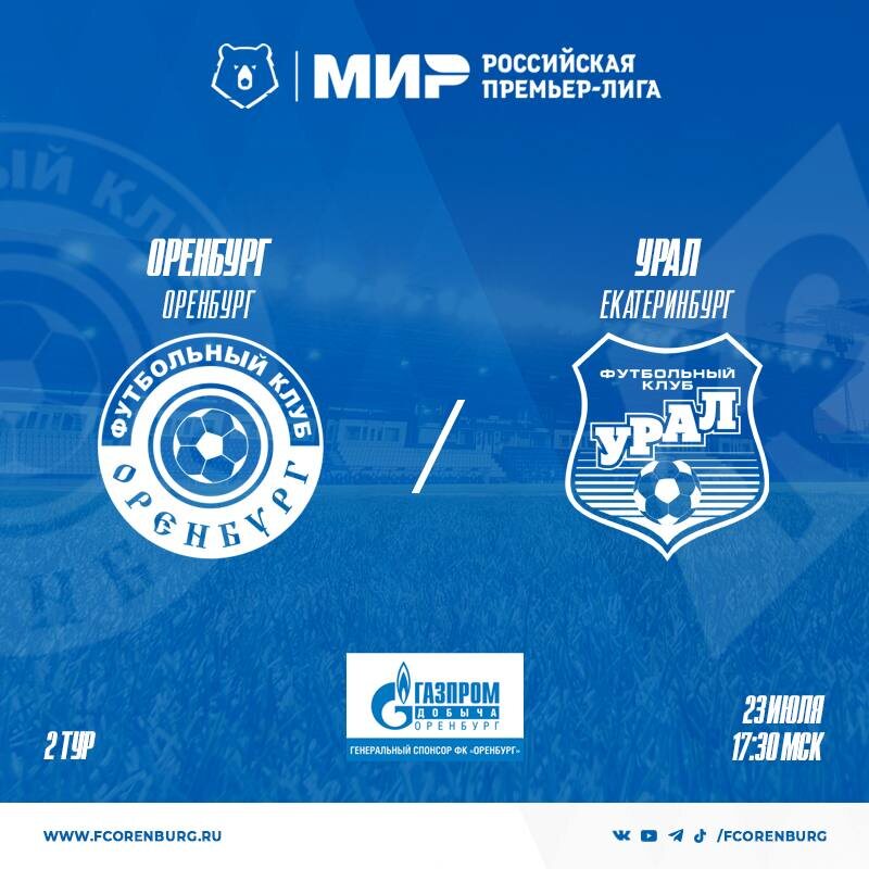 ОРЕНБУРГ – УРАЛ. ПРЕВЬЮ 23 июля в 19.30 (время оренбургское) на стадионе «Газовик» состоится матч МИР Российской Премьер-Лиги «Оренбург» - «Урал» 📺 💻Прямая трансляция матча на телеканале Матч!Премьер 🟨🟥 Судьи: Бобровский Ян (Санкт-Петербург), Мурашов Валентин (Москва), Елеференко Илья (Москва) резервный судья – Черемных Михаил (Пермь) VAR – Иванов Сергей (Ростов-на-Дону) AVAR – Чельцов Дмитрий (Москва) инспектор – Синер Игорь (Омск) делегат – Поляков Алексей (Люберцы) ⛅🌡Погода во время матча +24 +28°C, облачно с прояснениями, ветер северный 3 м/с ⚽ История взаимоотношений в рамках Первенств России Игр – 19, Побед «Оренбурга» («Газовика») – 2, побед «Урала» («Уралмаша») – 14, ничьи – 3. Разница забитых-пропущенных (Оренбург - Урал) 9 – 29 2020-07-01 "Оренбург" Оренбург "Урал" Екатеринбург -:+ (техническое поражение «Оренбурга») 2019-11-04 "Урал" Екатеринбург "Оренбург" Оренбург 1:2 2019-05-10 "Оренбург" Оренбург "Урал" Екатеринбург 2:2 2018-11-10 "Урал" Екатеринбург "Оренбург" Ор