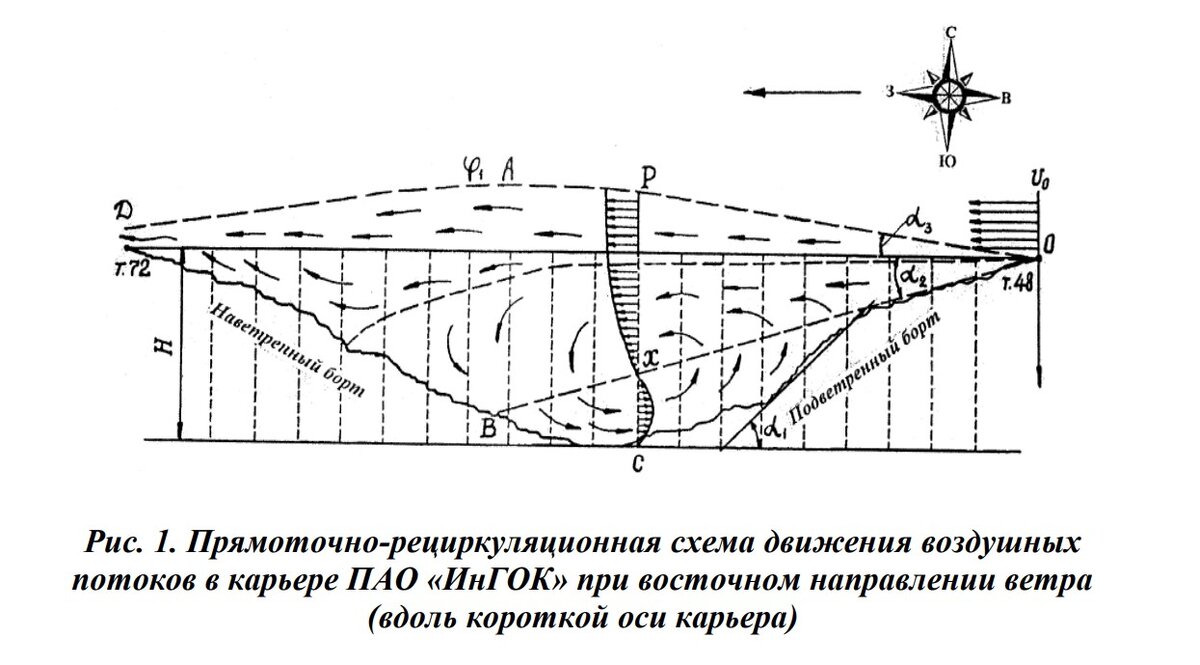Причиной повышенного, но, как правило, кратковременного загрязнения воздушной среды карьера и прилегающего района являются взрывные работы. Газопылевое облако при мощном массовом взрыве выбрасывает на высоту 150-250 м, а затем, достигнув уровня конвекции, распространяется по ветру на значительные расстояния. Объем облака составляет 15-20 млн.м3 , а концентрация пыли достигает в нем 4000 мг/м3 . При взрывах выделяются также значительные объемы ядовитых газов – в основном окись углерода и окислы азота. Количество газов зависит от типа ВВ и свойств взрываемых пород. Интенсивным и постоянно действующим источником загрязнения воздушной среды в карьерах является автотранспорт. Выхлопные газы двигателей внутреннего сгорания представляют сложную многокомпонентную смесь. В их составе содержится более 200 различных веществ. Из аэрозольных компонентов наиболее опасна сажа, выбрасываемая в виде частиц с преобладающим размером 0,05-0,5 мкм. Частицы сажи, обладая значительной удельной поверхностью (до 75 м3 /г), адсорбируют канцерогенные и другие токсичные вещества, которые, попадая в организм человека, могут привести к тяжелым последствиям [2, 3]. Следует отметить, что при естественном воздухообмене регулирование и управление пылегазовым и климатическим режимами воздушной среды карьеров осуществляется за счет природных аэродинамических и тепломассообменных процессов. Применяемые организационно-технические и технологические мероприятия обеспечивают лишь частичное сокращение выбросов загрязняющих веществ в окружающую среду. Однако при отсутствии осадков (дождь, град, снег, иней), выделяющиеся при работе технологического комплекса вредные примеси выносятся ветровыми потоками и загрязняют прилегающие к карьерам территории. Проветривание выработанного пространства карьеров ветровыми потоками может осуществляться по прямоточной, рециркуляционной, прямоточно-рециркуляционной и рециркуляционно-прямоточной схемам [4]. При восточном направлении ветра вдоль короткой оси на карьере ПАО «ИнГОК» возможна прямоточно-рециркуляционная схема проветривания (рис.1). В нижней части карьера происходит слабый воздухообмен. Одна треть пространства проветривается недостаточно. Это вызвано тем, что проветривание этого участка происходит струей второго рода. Она принимает участие в рециркуляции, а не в прямой циркуляции воздушных масс. Это происходит из-за естественной геометрии карьера и его бортов. Подветренный борт, круто падающий, имеет угол наклона около 42 градусов. Следуя классификации Никитина В.С. [5], этот карьер проветривается по прямоточно-рециркуляционной схеме проветривания. Она образовалась в связи с изломом подветренного борта карьера. Раскрытие свободной струи не может превышать 15 градусов, поэтому зона, находящаяся ниже линии ОВ проветривается только за счет рециркуляционной воздушной струи II рода.