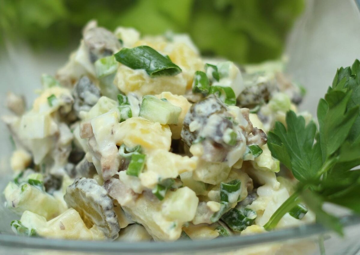 Ингредиенты - маринованные грибы - 800 гр - творог -100 гр - молоко - 1ст. л. - репчатый лук - 1 шт. - зелень - соль Творог протереть через сито, добавить молоко и измельченный репчатый лук. Массу тщательно перемешать в блендере, посолить по вкусу. Маринованные грибы мелко нарезать, соединить с творожной массой и аккуратно перемешать. Подавать салат, украсив зеленью.