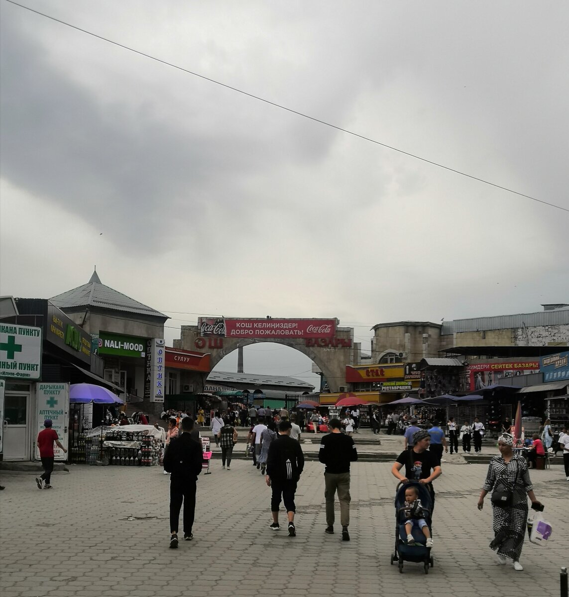 В отличие от Турции, Тайланда, Египта и других популярных у российского туриста стран, в Киргизии совершенно не развита торговля сувенирами. Не то, чтобы их там нет, но и на каждом шагу в любом магазине вы их не встретите. На вопрос, почему за первых два дня пребывания в Бишкеке, поездке в Ала-Арчу и к башне Бурана, я не нашла и не купила магнитики, сувенирные тарелочки и футболку с надписью «Я люблю Киргизию», местный житель ответил: так надо было в ГУМ или ЦУМ сходить и купить. С учетом складывающейся в этом году ситуации в сфере туризма, грядущее лето обещает приличный наплыв путешественников из России, а, значит, продажа сувенирной продукции принесет высокий доход местным жителям. Однако киргизы не торопятся занять эту нишу. Посетить ГУМ и ЦУМ в Бишкеке мне не удалось по причине ограничения по времени, планируя поездку в моем списке для обязательного посещения был Ошский базар, куда я в результате и отправилась. Парадный вход на Ошский базар Ошский базар представляет собой огромную