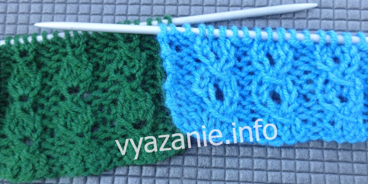 Подойдут и для летних, и для зимних изделий. Пряжа одинаковая, спицы одинаковые. Один более рельефный, на мой взгляд, даже изящный. Второй... А, впрочем, смотрите сами. Вязать буду поворотными рядами. В каждом узоре раппорт состоит из 5 петель и 4 рядов. Можно увеличить раппорт, добавив петли в изнаночных дорожках. Описание. Узор №1. Набираем число петель, кратное 5 +2 петли для симметрии +2 кромочные. 1 ряд. *1 изнаночная, 3 лицевые, 1 изнаночная*. 2 ряд. *1 лицевая, 3 изнаночные, 1 лицевая*. 3 ряд. *1 изнаночная, 1 снимаем, нить за работой, вяжем 2 лицевые и снятую петлю накидываем на них, 1 изнаночная*. Количество петель в ряду уменьшилось. 4 ряд. *1 лицевая, 1 изнаночная, накид, 1 изнаночная, 1 лицевая*. Количество петель стало первоначальным. Повторяем эти 4 ряда. Описание. Узор №2. Этот узор изящнее первого, пышнее, мельче. Набираем число петель, кратное 5 +2 петли для симметрии +2 кромочные. 1 ряд. *1 изнаночная, 3 лицевые, 1 изнаночная*. 2 ряд. *1 лицевая, 3 изнаночные, 1 л